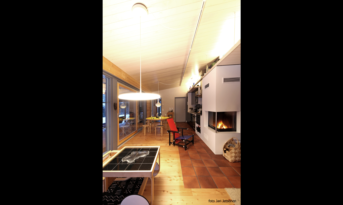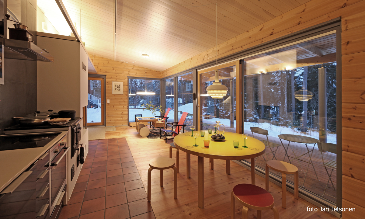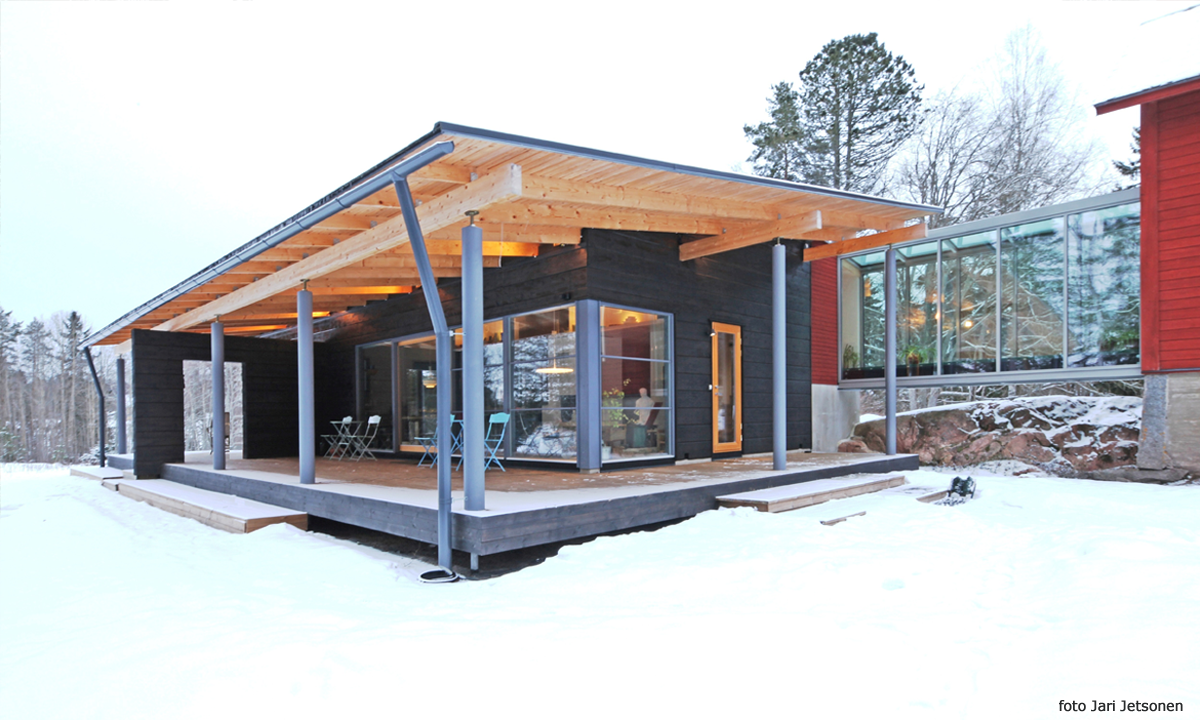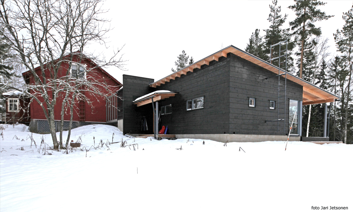 | Uudisrakennus on liitetty vanhaan hirsirakennukseen lasikäytävällä. | |